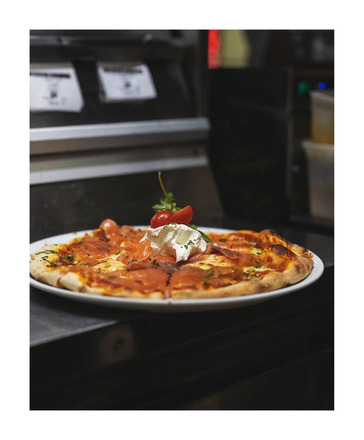 Sauce tomate, mozzarella, saumon fumé, crème de mascarpone et basilic