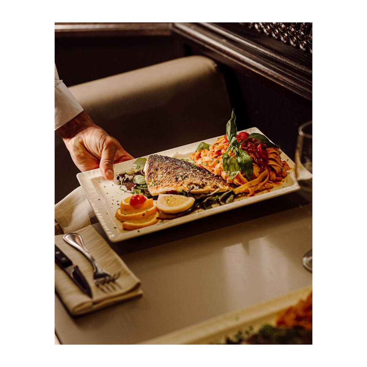 Filet de bar à la crème, tomates cerises, olives noires et pignons, servi avec pâtes et huile d’olive