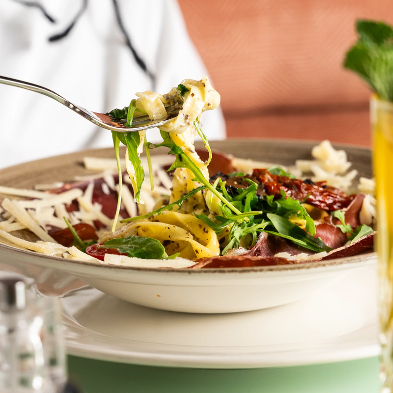Tagliatelles crème à la truffe, bœuf séché, roquette, parmesan, tomates séchées