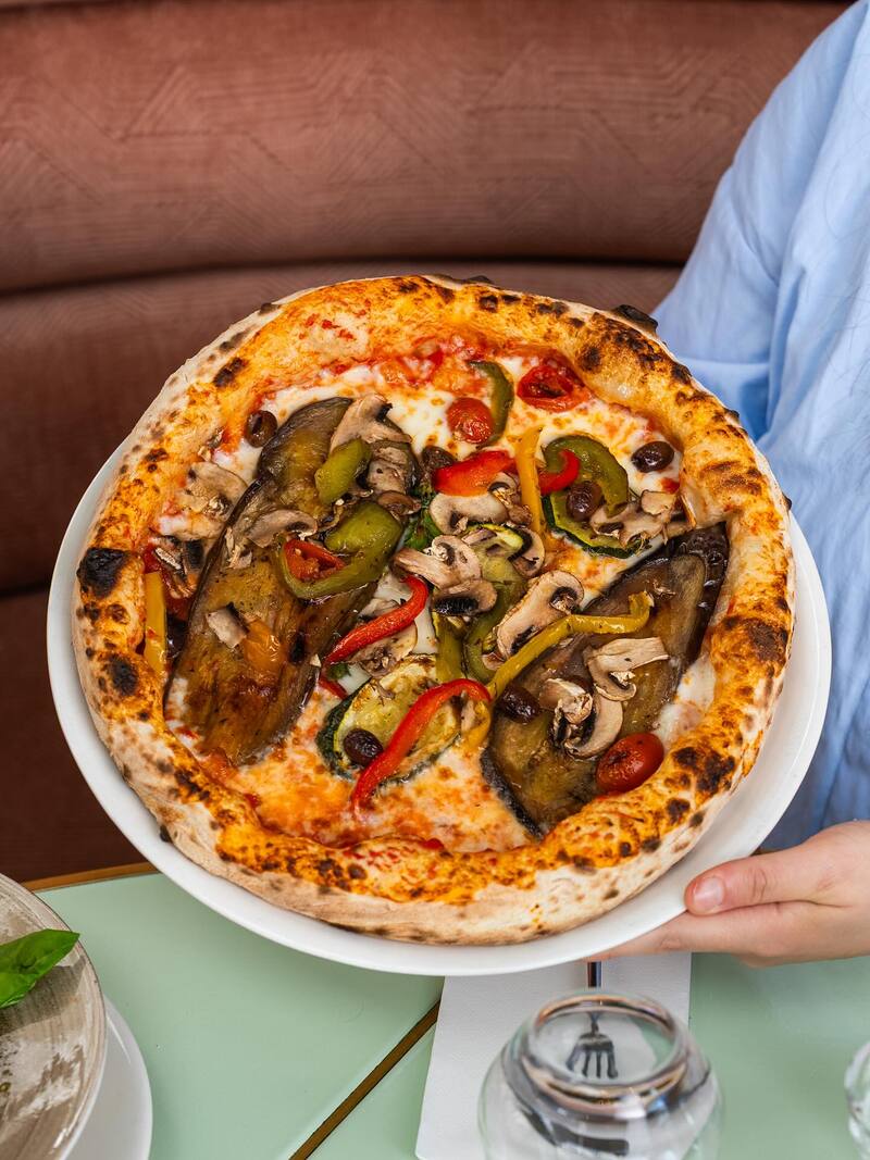 Tomate San Marzano, fleur de lait, courgettes, poivrons, aubergines, champignons, tomates confites, olives noires, basilic