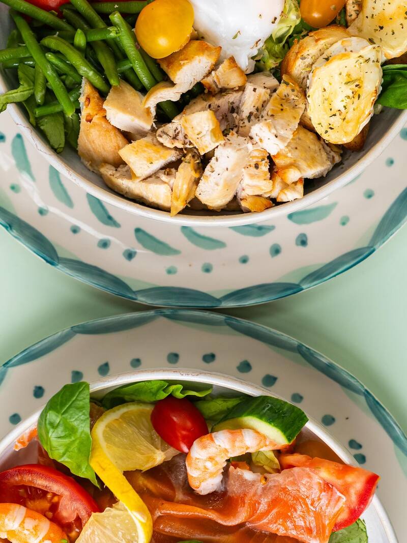 Salade, poulet, chèvre chaud, haricots verts, jambon de veau, emmental, œuf poché